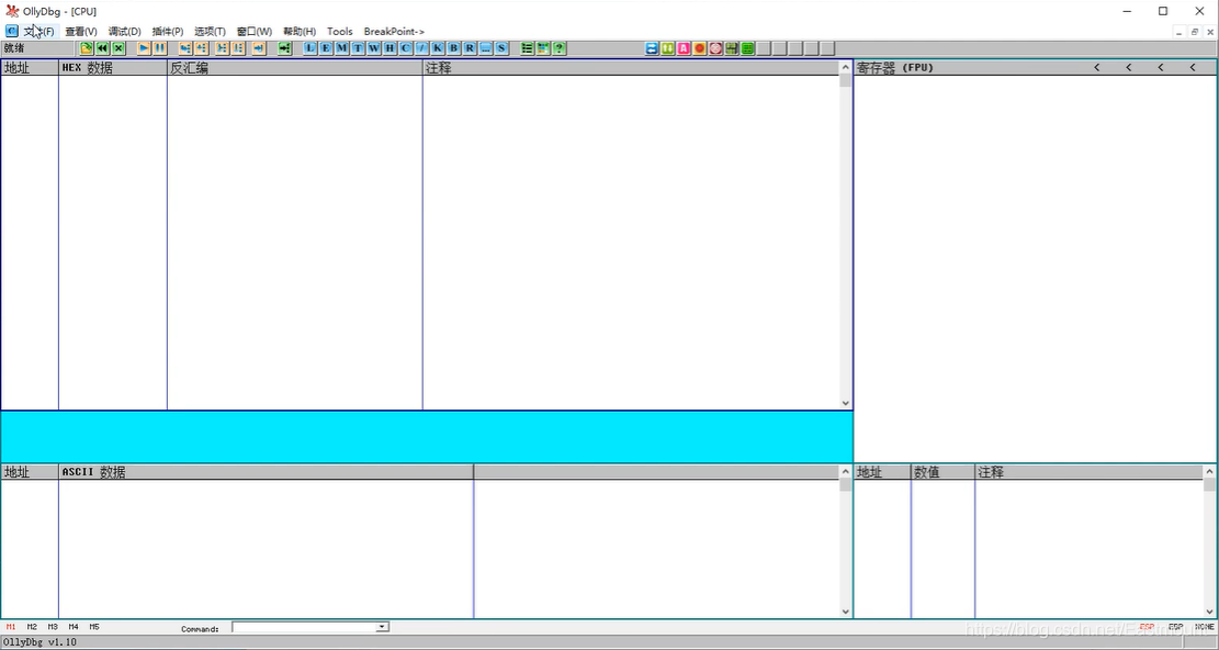 • 反汇编窗口: 显示被调试程序的反汇编代码,包括地址、HEX数据、反汇编、注释