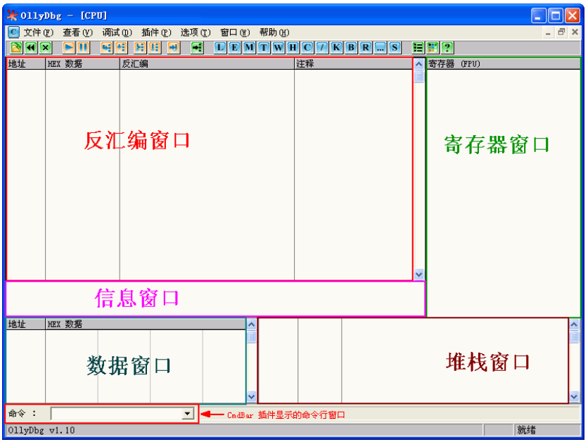 包括反汇编窗口、寄存器窗口、信息窗口、数据窗口、堆栈窗口。